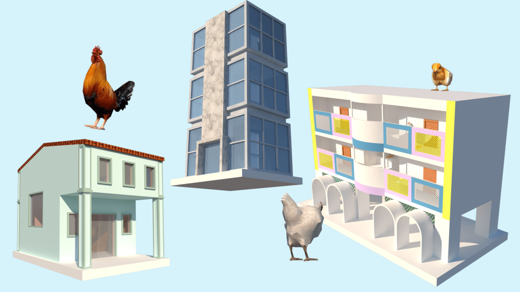 There were a lot of considerations behind it; from scaling them to make them ideal for the junglefowl, figuring out the materials of the buildings to keep them true to the source, and accenting certain features of the architecture in the area.