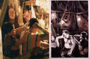 The wayang stage was still a common sight when I was growing up in Singapore, especially around religious festivals. I started to visit backstage as research when I was a student at NAFA. Wayang was a subject for my painting practice and also my playwriting in my 20s. Observing the transformations taking place between onstage and backstage was akin to travelling in time and space, between mythological fantasy worlds and the humble human realities of a theatre troupe.