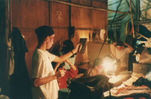 The wayang stage was still a common sight when I was growing up in Singapore, especially around religious festivals. I started to visit backstage as research when I was a student at NAFA. Wayang was a subject for my painting practice and also my playwriting in my 20s. Observing the transformations taking place between onstage and backstage was akin to travelling in time and space, between mythological fantasy worlds and the humble human realities of a theatre troupe.