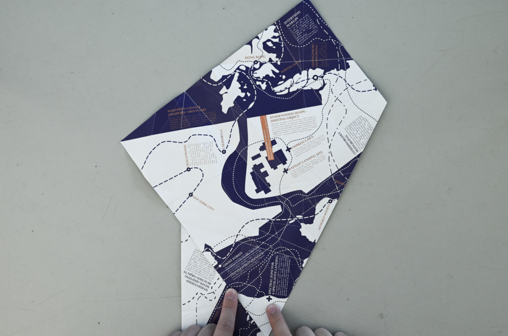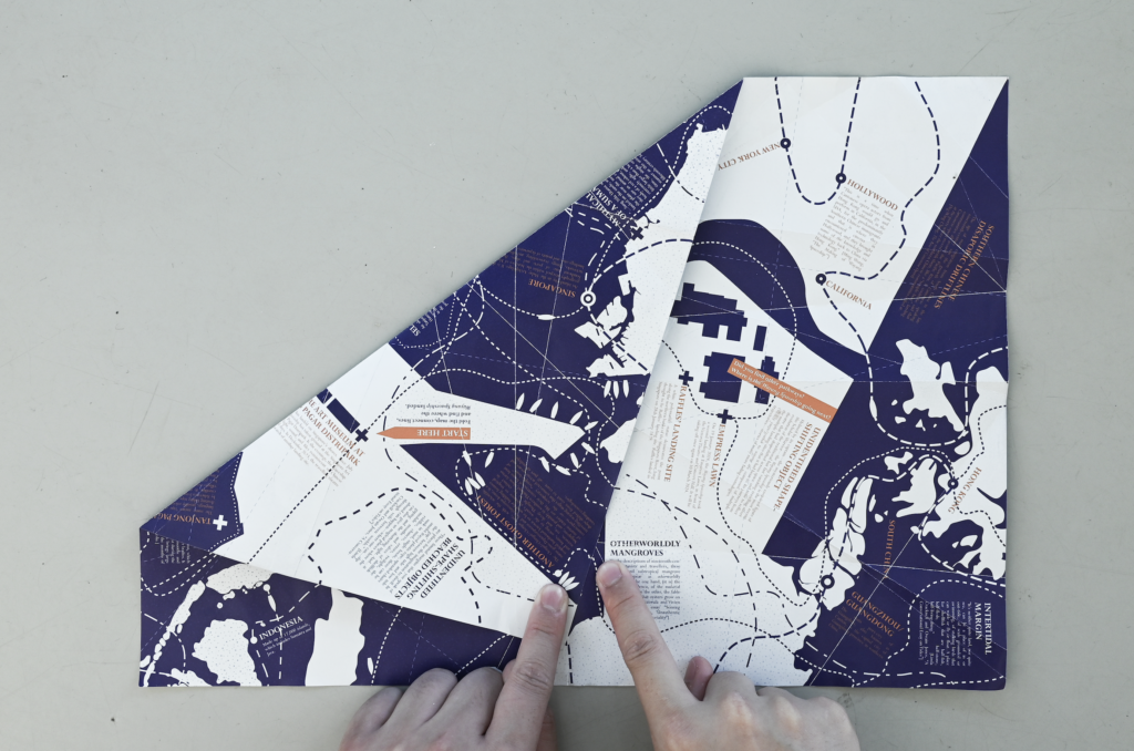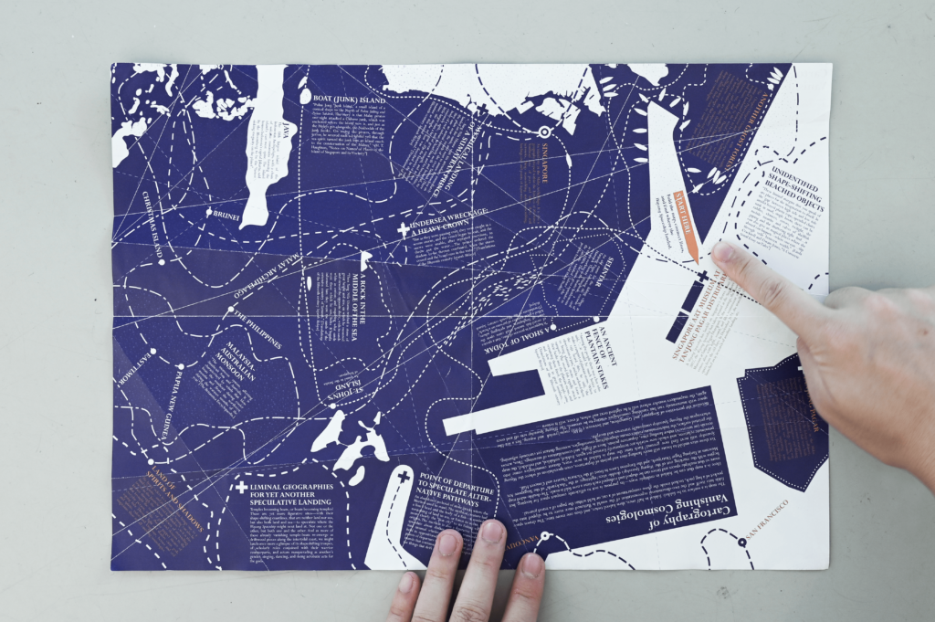 Here is a map that can be folded in multiple ways—its purpose is not to efficiently compact space for keeping, but more so that multiple spaces and times can be shaped and reshaped each time a new fold is made. Each time the map is folded in new ways, distant cosmologies come into proximate relations, and whole new worlds are temporarily formed yet again. Folded, unfolded, and refolded, the map reveals (or uncovers) other landing sites, departure points, lines of flight, and constellations of meanings. Thus, across the printed surface, the indeterminate routes create shape-shifting cosmologies, seeming distant yet curiously adjoining, whereupon the Wayang Spaceship continually traverses and morphs.