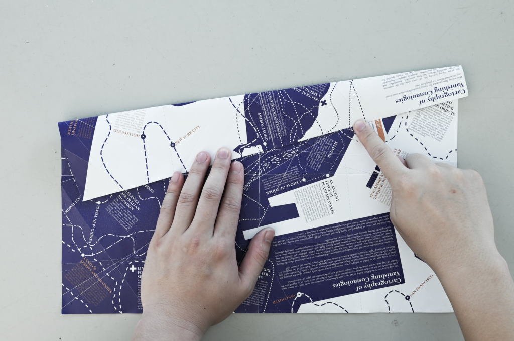 2. As you follow the dotted line leading away from the starting point, make a diagonal fold across the map, so that the dotted line on the opposite surface aligns with the path that you took. With your finger, trace the line as it moves along the opposite surface, and another cosmological network comes into view.