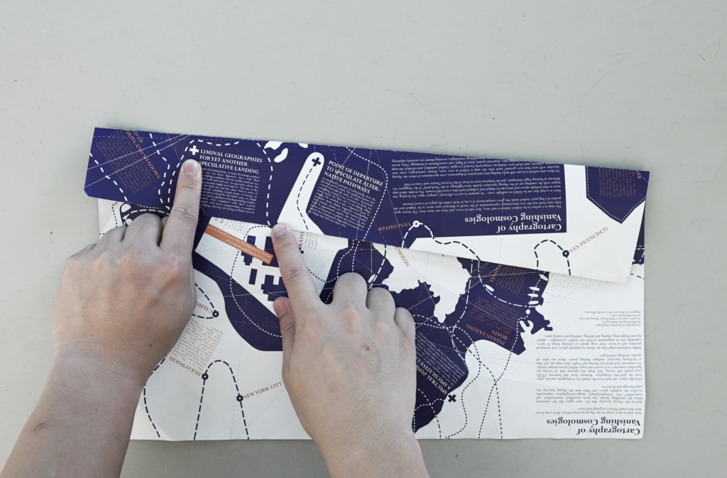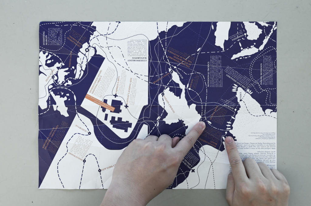 Unlike traditional maps that are drawn to pinpoint places with measured precision and accuracy, this map speaks of unfixing things in space, expanding into an imagination of fluid and mobile cosmologies—appearing and disappearing, shaping and shifting, colliding and coming apart.”