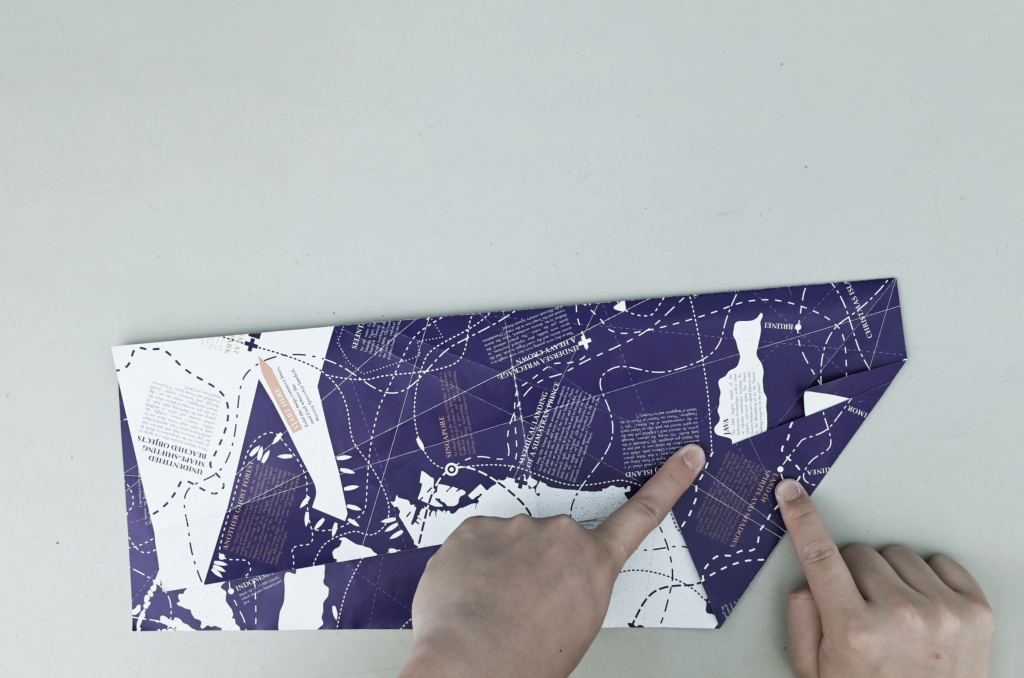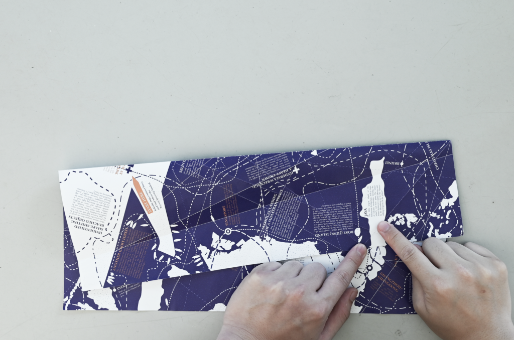 6. From Java, we might decide to now hop off the island and follow a boat as it journeys across the ocean. Another fold of the map connects the dotted lines to an ethereal place in the middle of the sea.