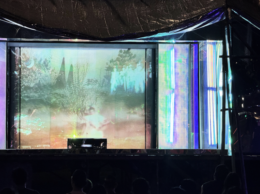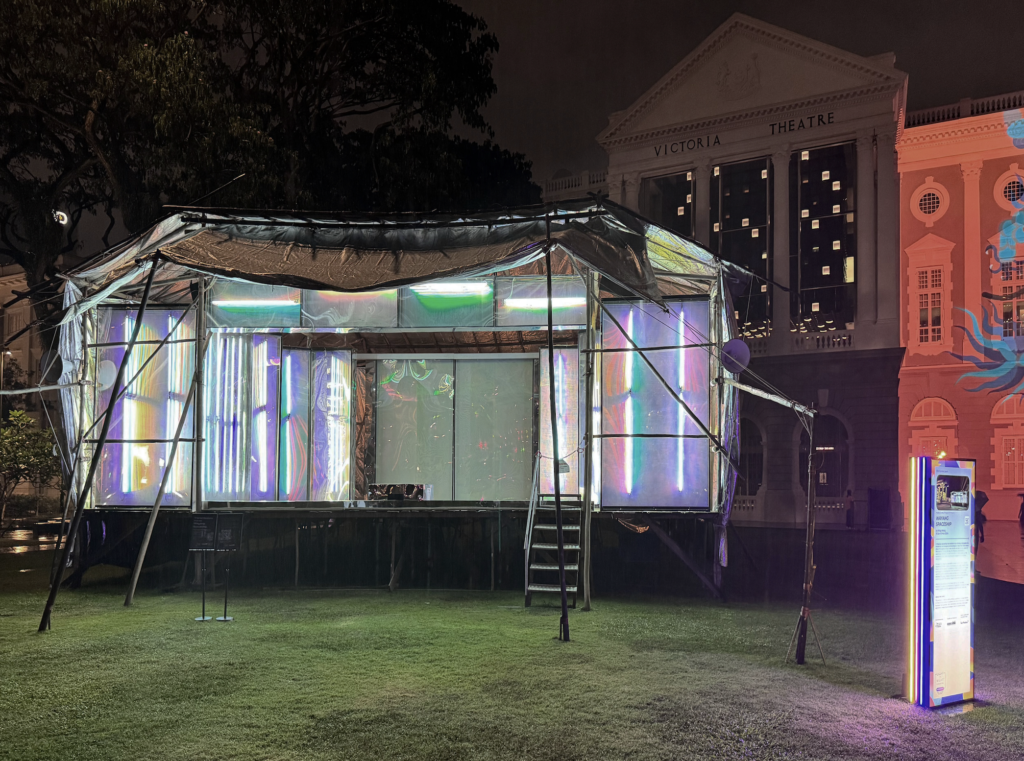 19 January, 7.30pm. The opening night of 2024’s Light to Night Festival was a very wet one indeed. Carrying umbrellas amidst a tropical downpour, we braved the weather and trudged to the corner of the soggy Empress Lawn in front of the Victoria Theatre and Concert Hall, where Ming Wong’s Wayang Spaceship perched lightly on the ground—spotted again since it last set off from the Tanjong Pagar Distripark. It is a makeshift structure of timber stakes lashed together with ropes, supporting an elevated stage. A tent made of silvery weatherproof canvas sheltered the stage and its electrically lit interiors from the ongoing rain. Our reflections appeared warped when we peered into the acrylic panels lighted by fluorescent tubes with dichroic film installed on the wayang stage.