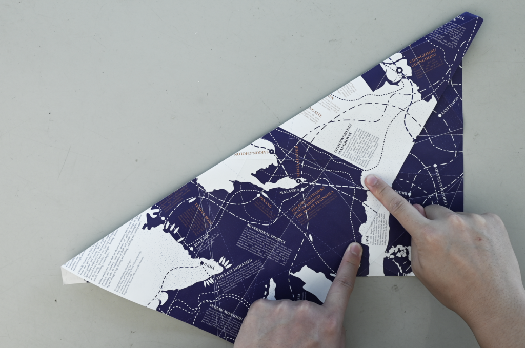 6. From Java, we might decide to now hop off the island and follow a boat as it journeys across the ocean. Another fold of the map connects the dotted lines to an ethereal place in the middle of the sea.