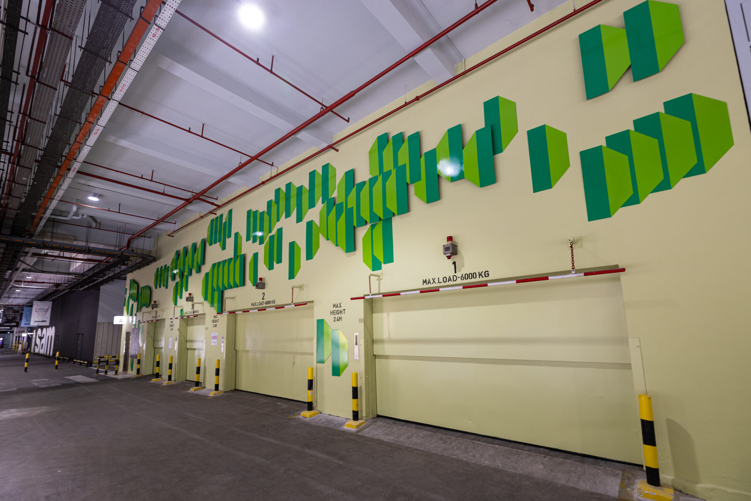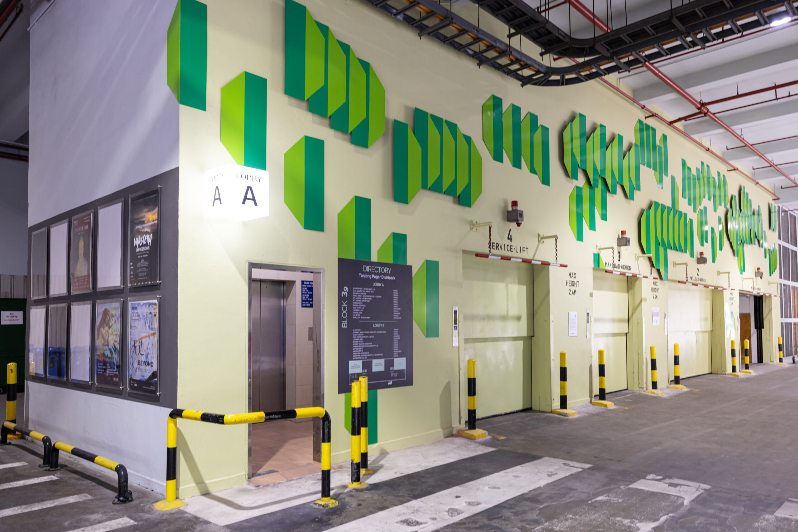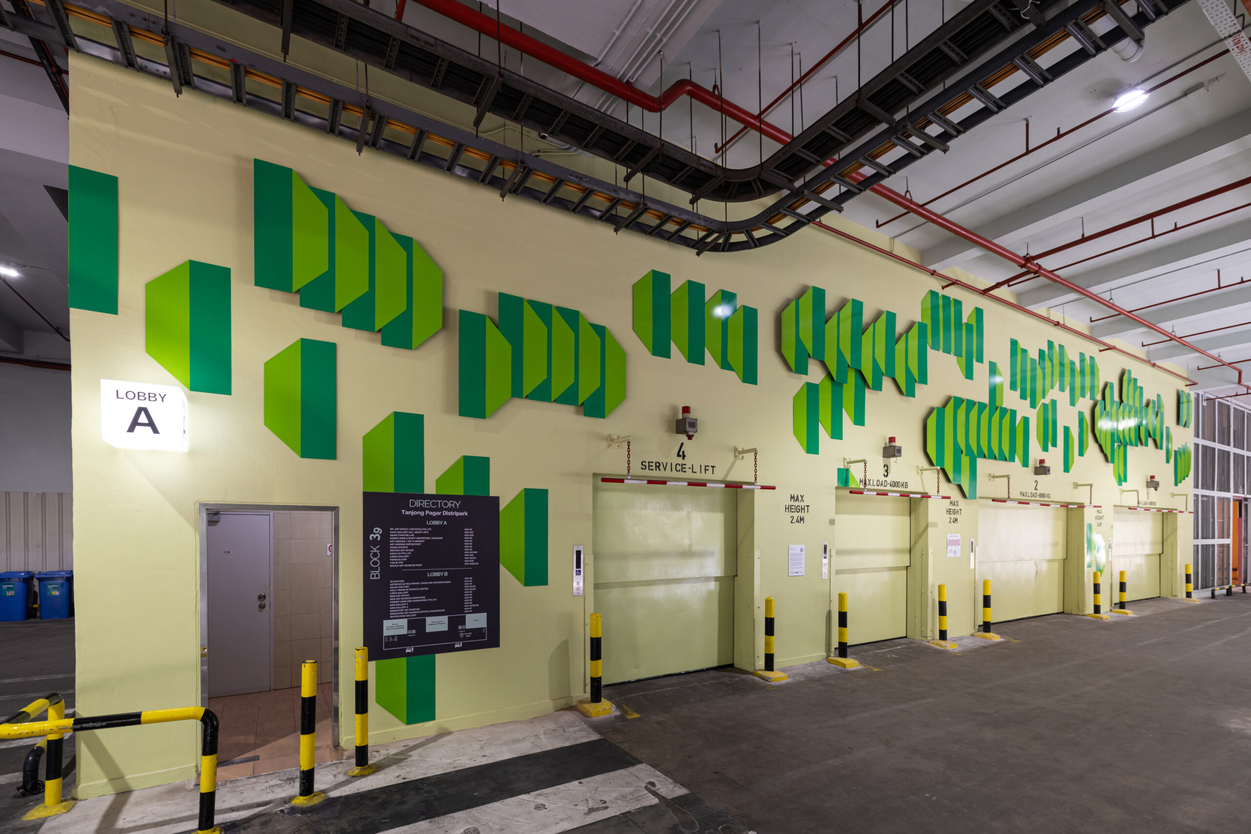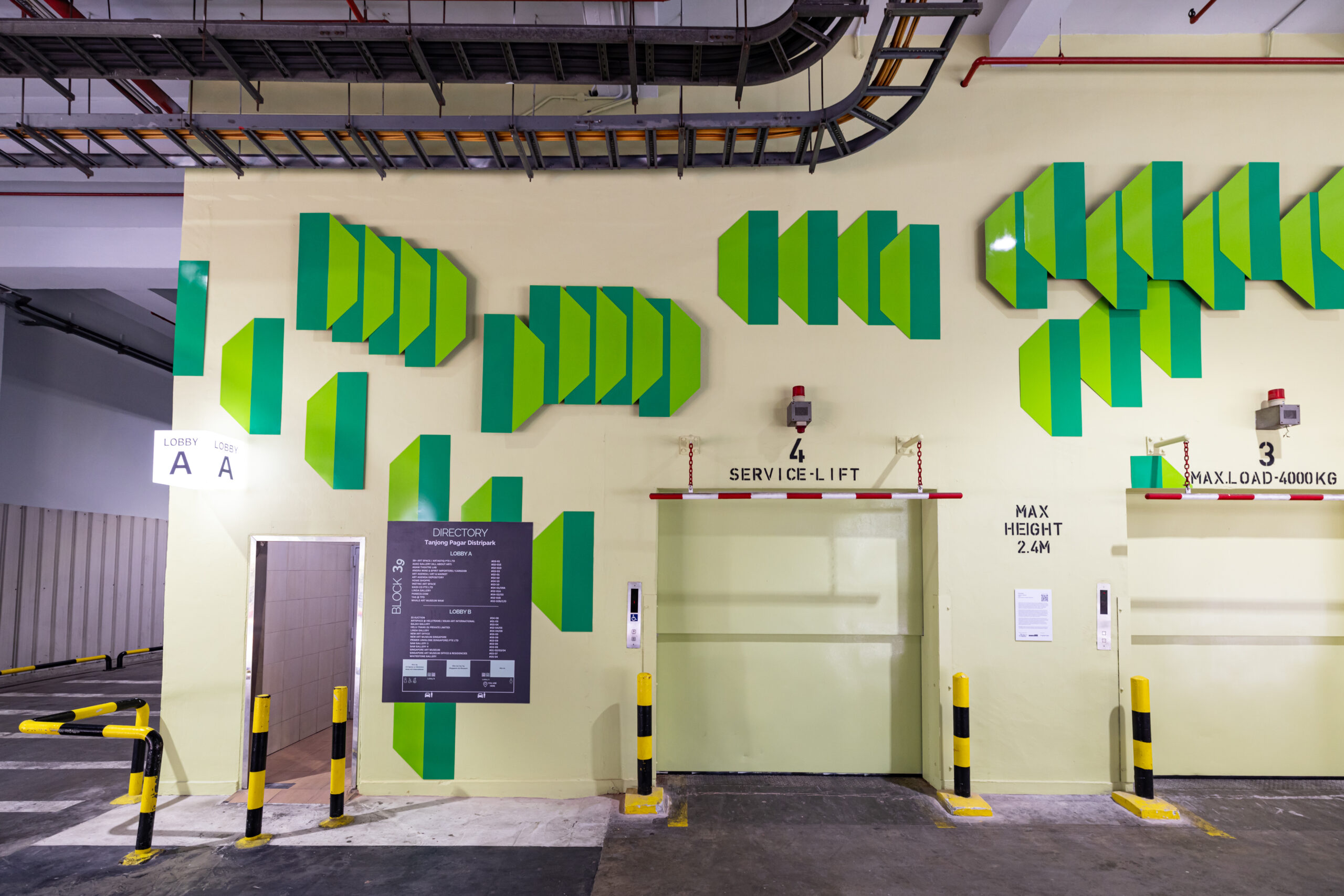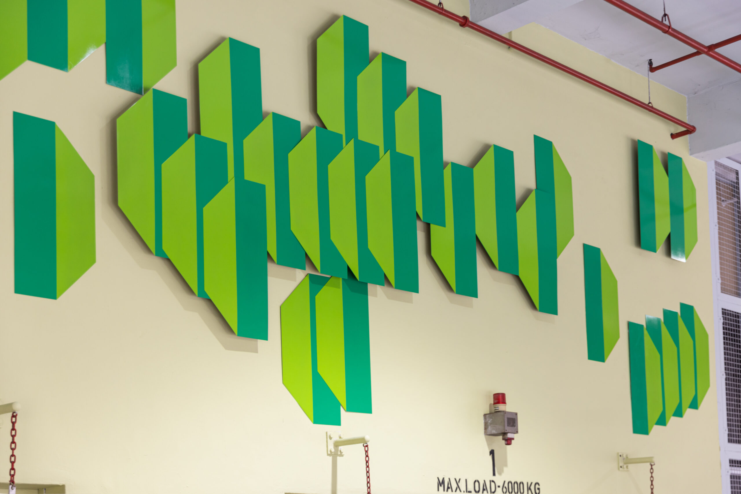 Greener Pastures turns the industrial space into one of contemplation. It draws on cuboid forms, such as the containers, pallets, and boxes that define its surroundings. Positioned above the cargo lifts at Tanjong Pagar Distripark, the installation renders utilitarian shapes into a flowing pattern that explores themes of movement, function and identity. By emphasising the rhythms of the site, it captures the alignment, repetition, and spatial relationships between everyday objects, while inviting viewers to see the beauty in geometric precision and underlying order.