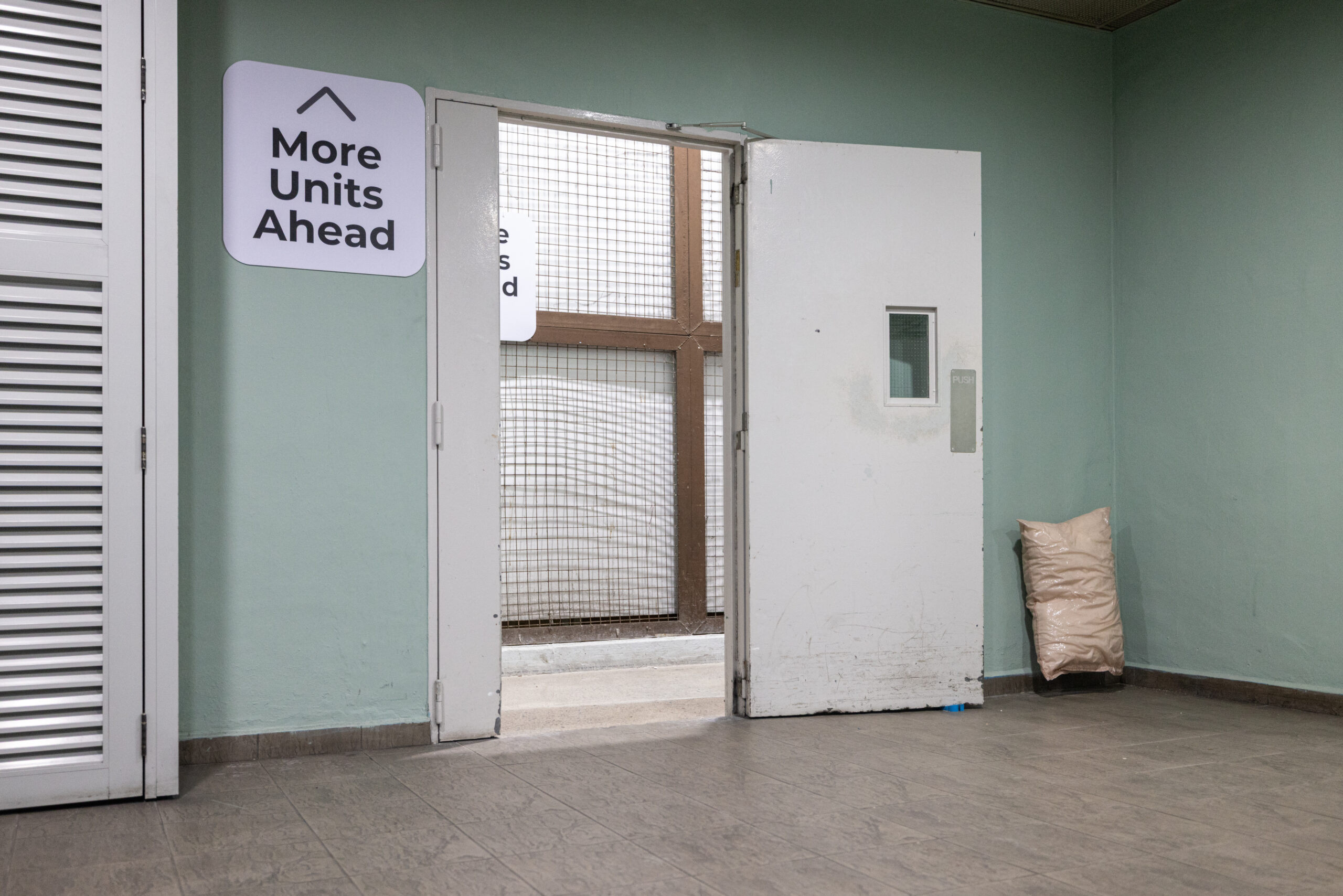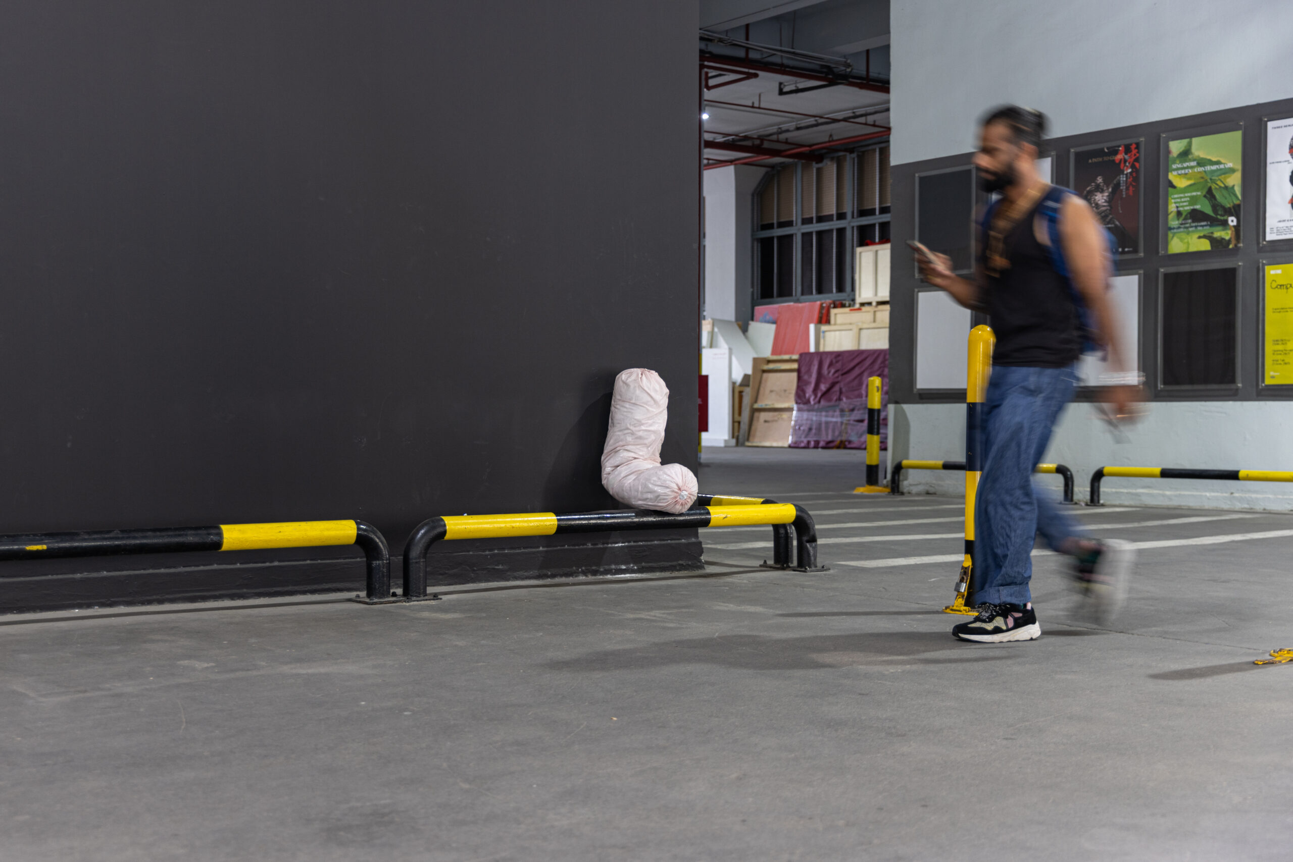 Through regular site visits, the artist observed how workers intuitively rest in in-between spaces, leaning into barrier gaps or sitting on ledges. Responding to these gestures, he introduced an additional intervention: a cushion embedded within the gap of a safety barrier, made from faux leather and foam. Subtle but purposeful, it transforms an overlooked ledge into an informal resting spot, an understated nod to the people who keep the site in motion.
