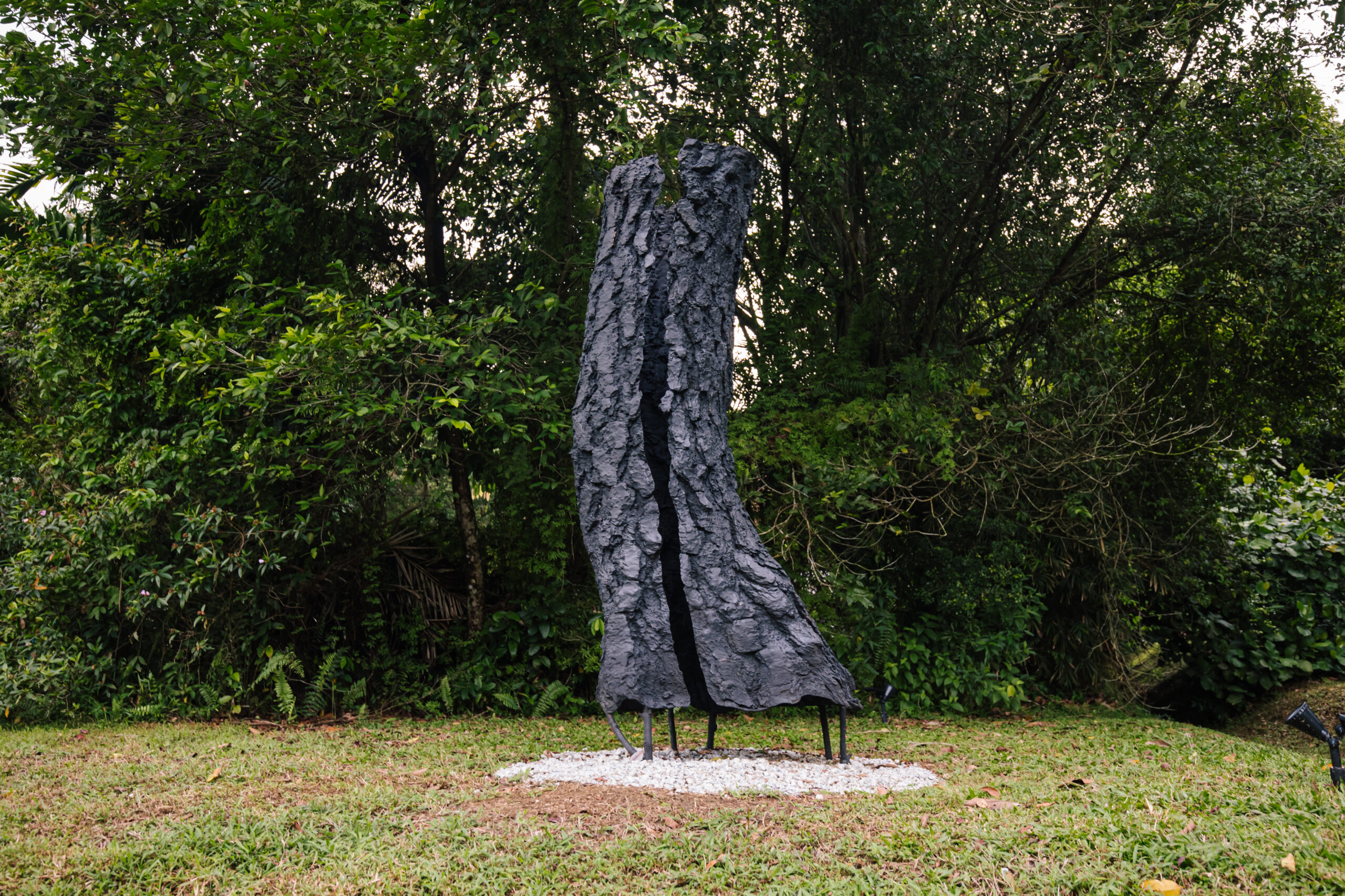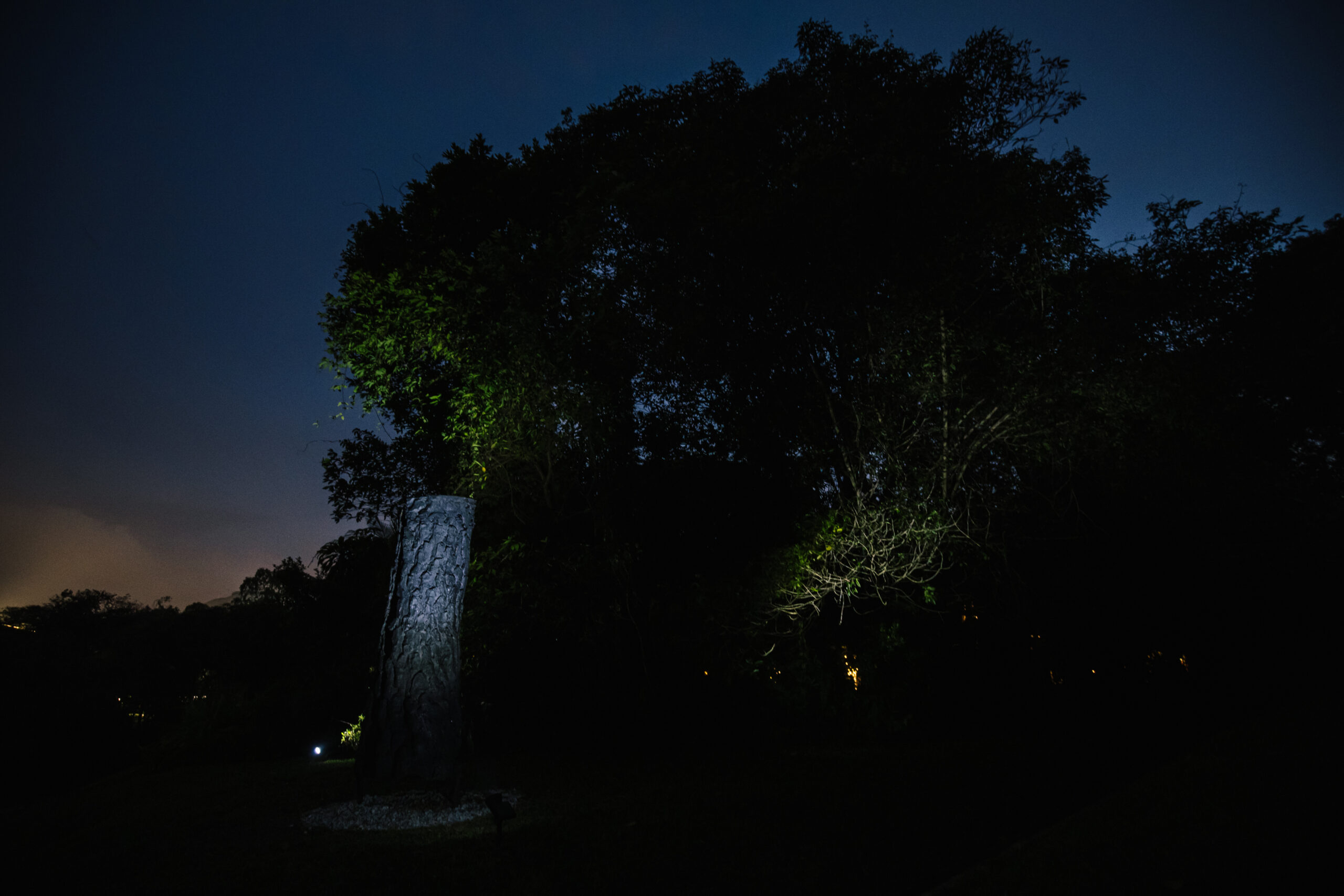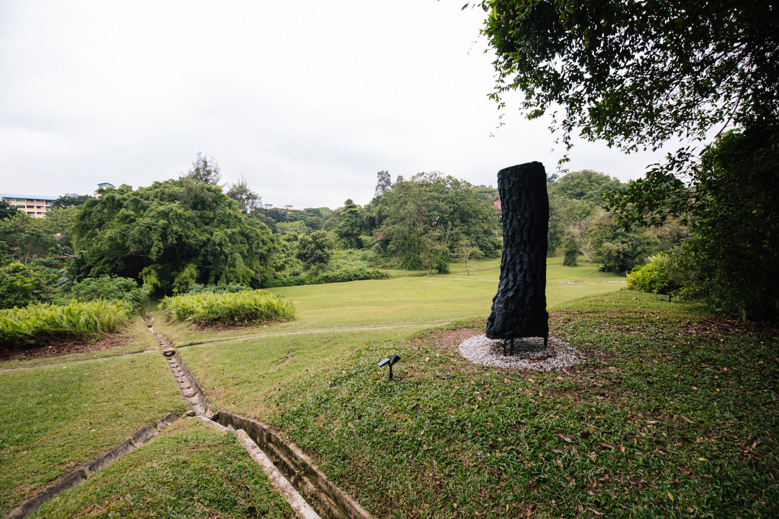 A cast bronze sculpture that embodies the fossilised remains of terrestrial vegetation. During the day, the sculpture is a sublimation of a burnt log, its digitally-modified body appearing as a mirage amidst the landscape of Wessex Estate. At night, the sculpture recedes into the shadowy vegetation surrounds. Encounters with this peculiar object along the clearing is quite like traversing the boundary between imaginative form and objective reality.