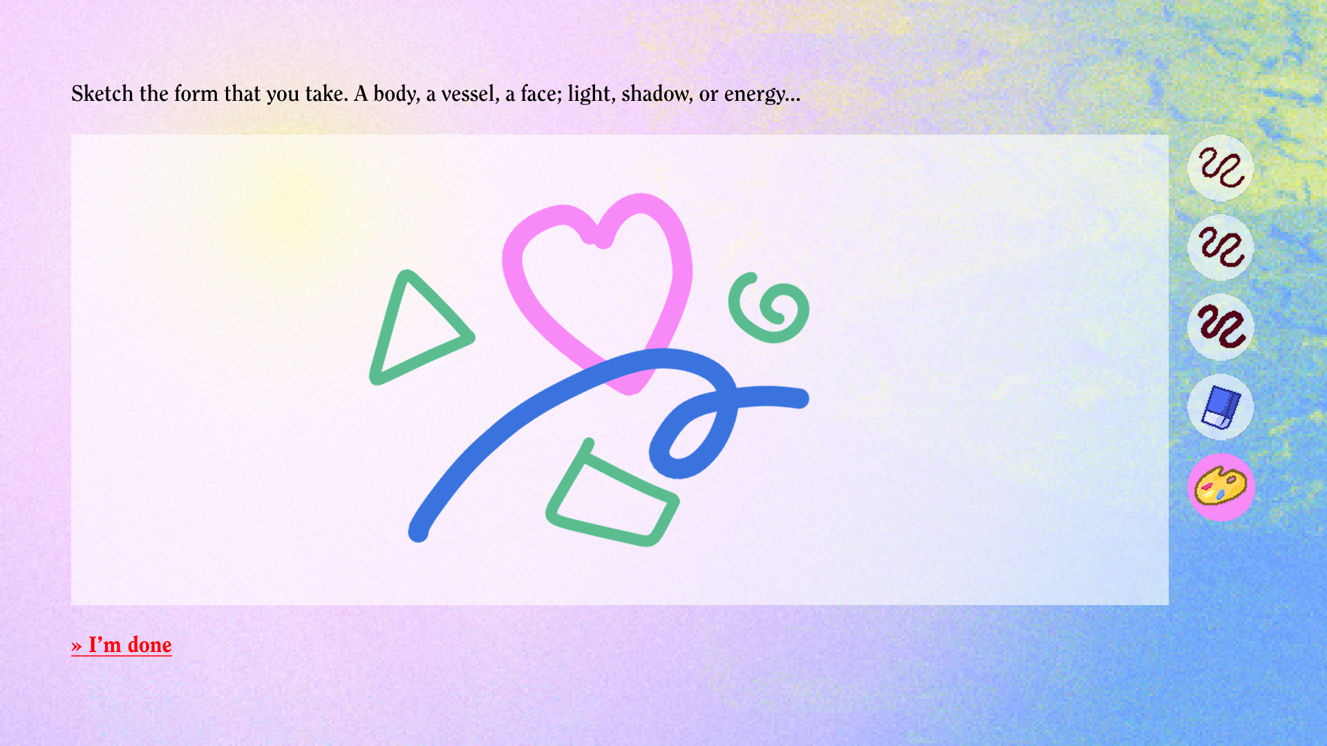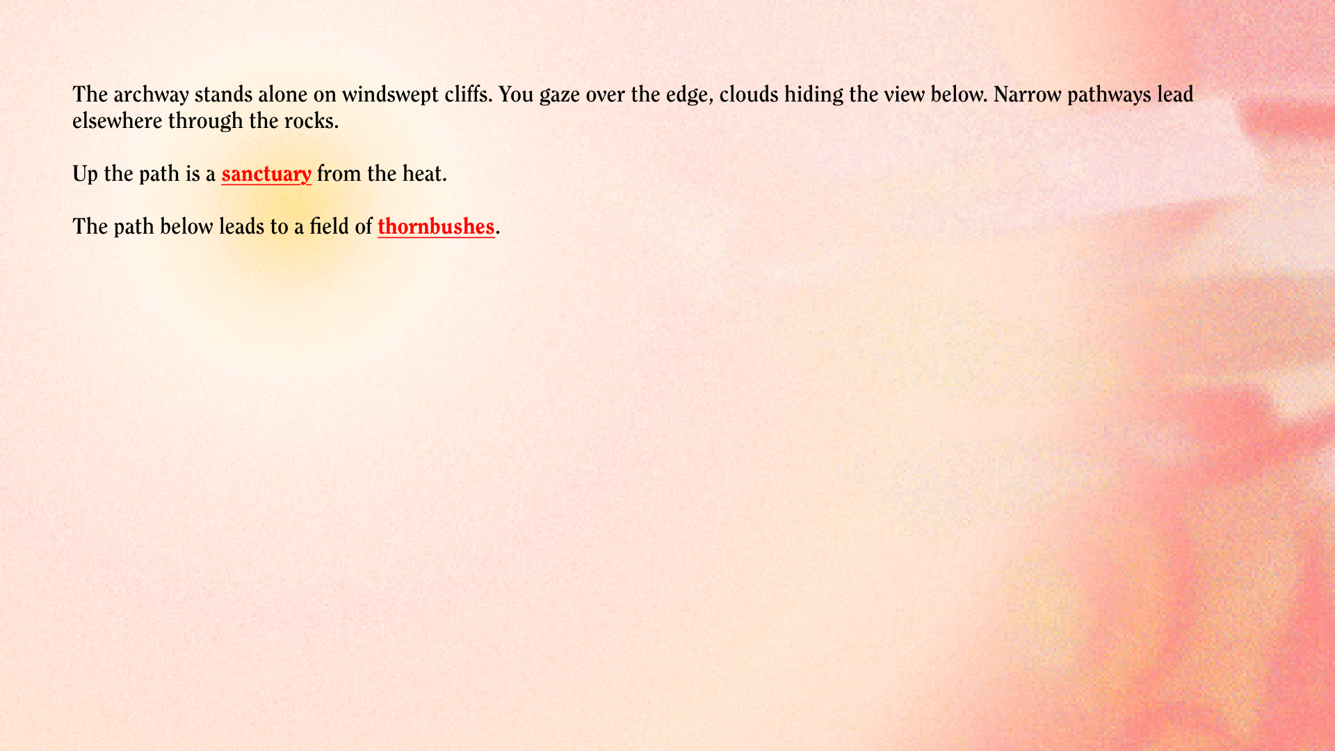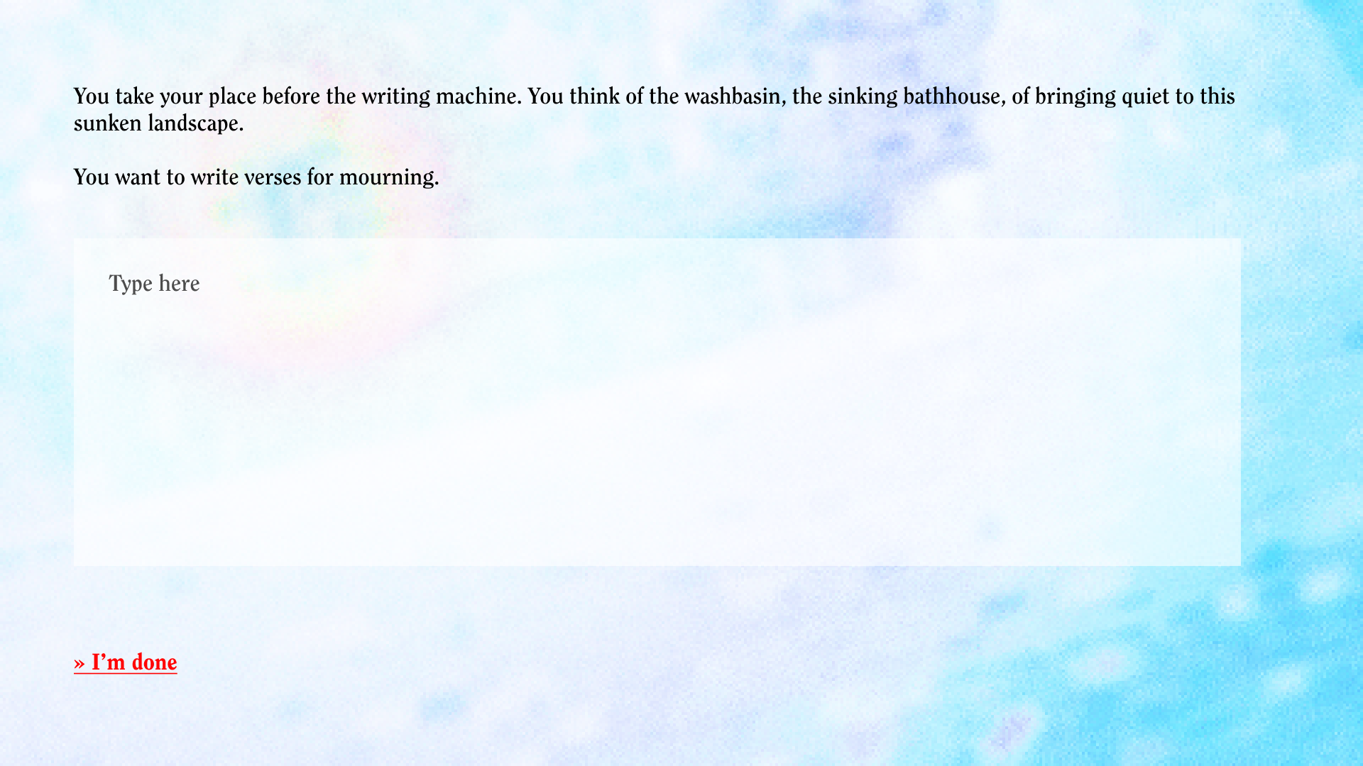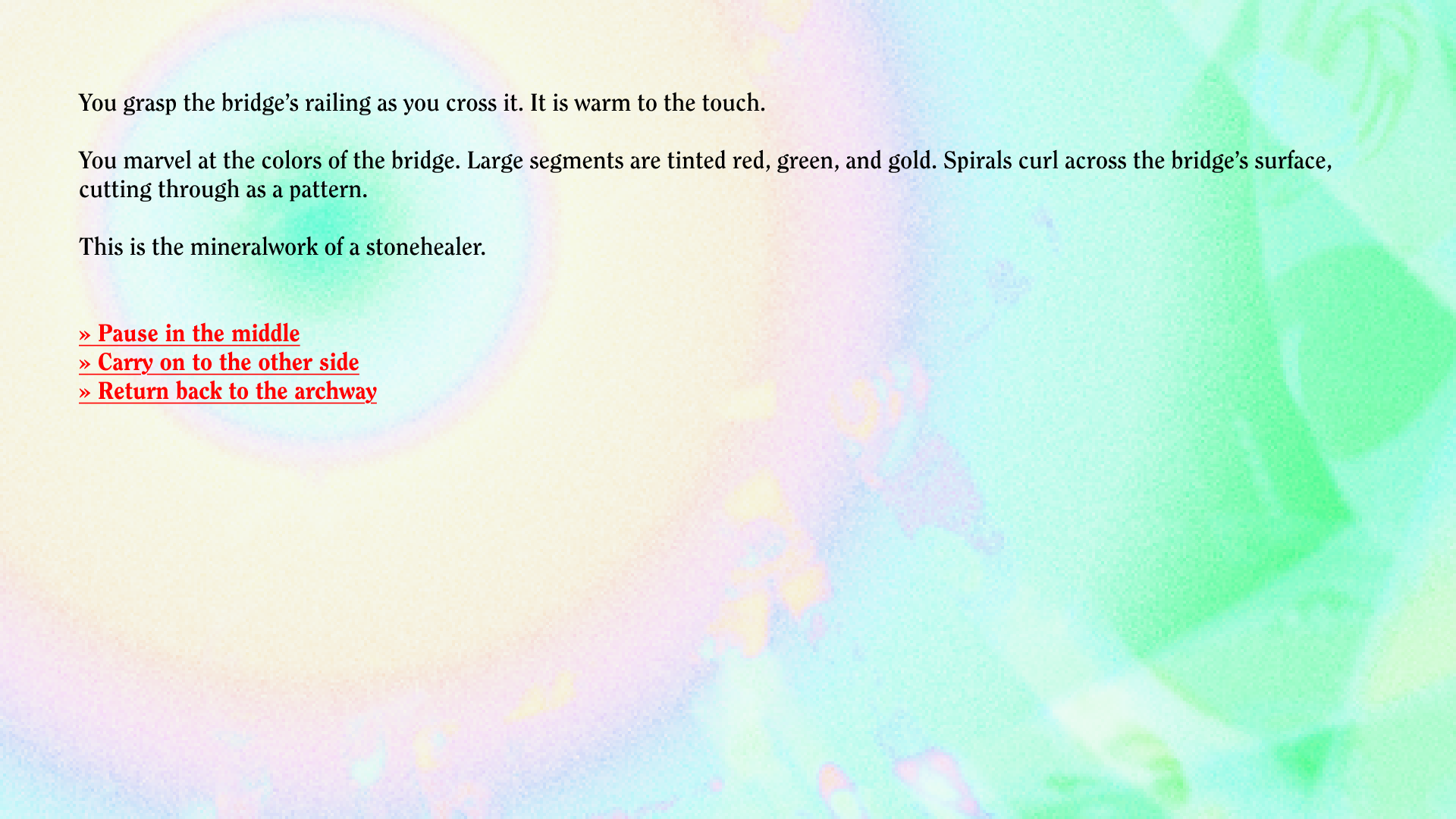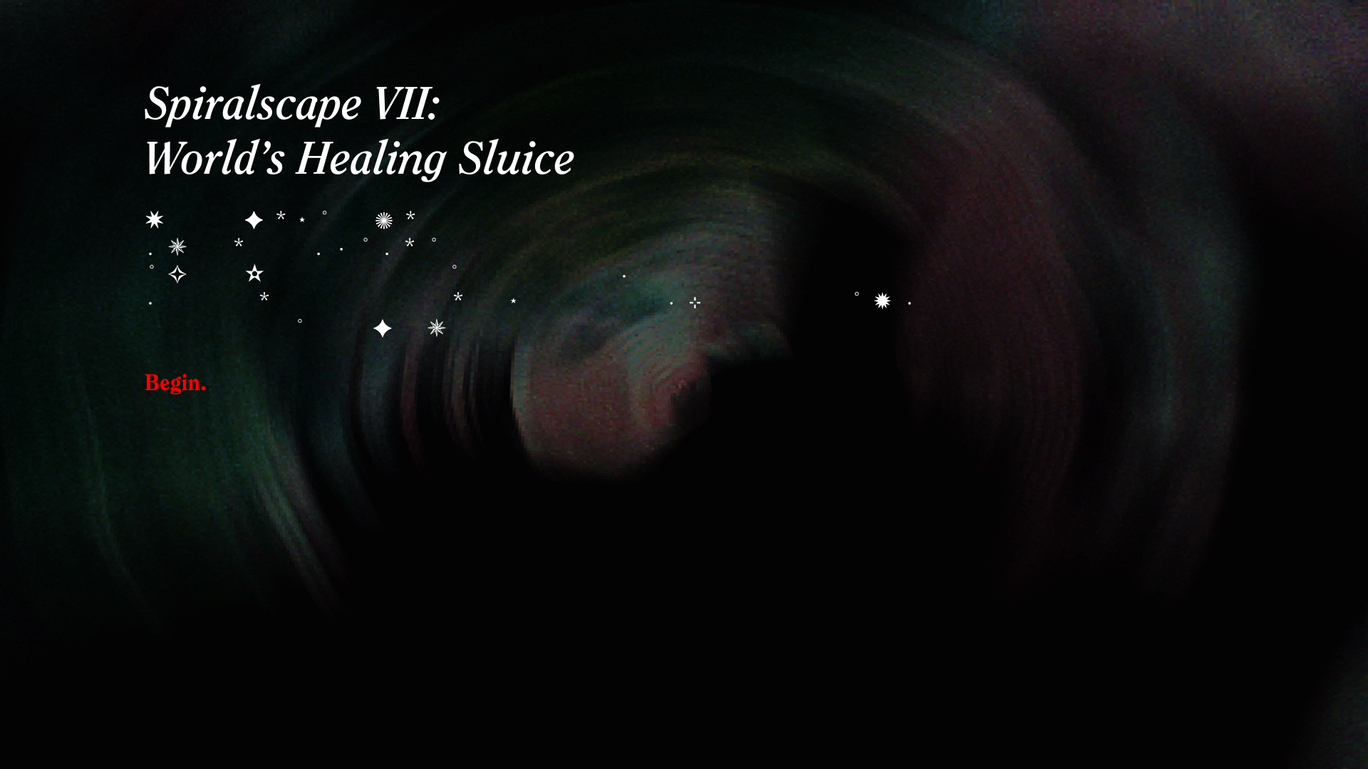 Spiralscape VII: World’s Healing Sluice is a text-based adventure video game that opens gateways to other universes. Players take on the role of a “stonehealer”, a part-craftsman and part-mage character who hails from a world of statues, navigating ruined landscapes in need of mending. Guided by branching narrative choices, written responses and digital sketches fed into the game, players explore fantasy worlds in disrepair, each defined by a central landmark: a fountain, a bridge and a façade.
