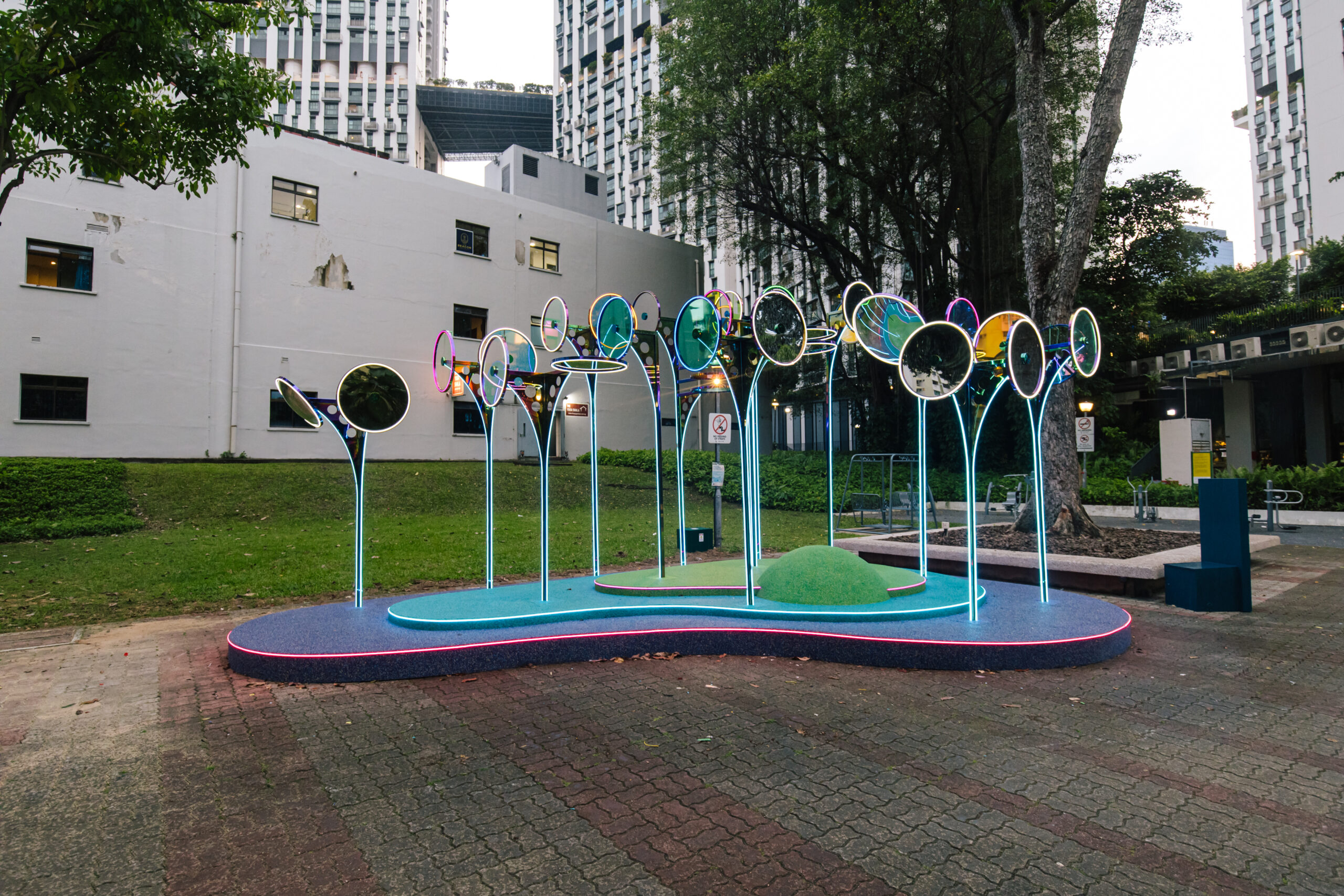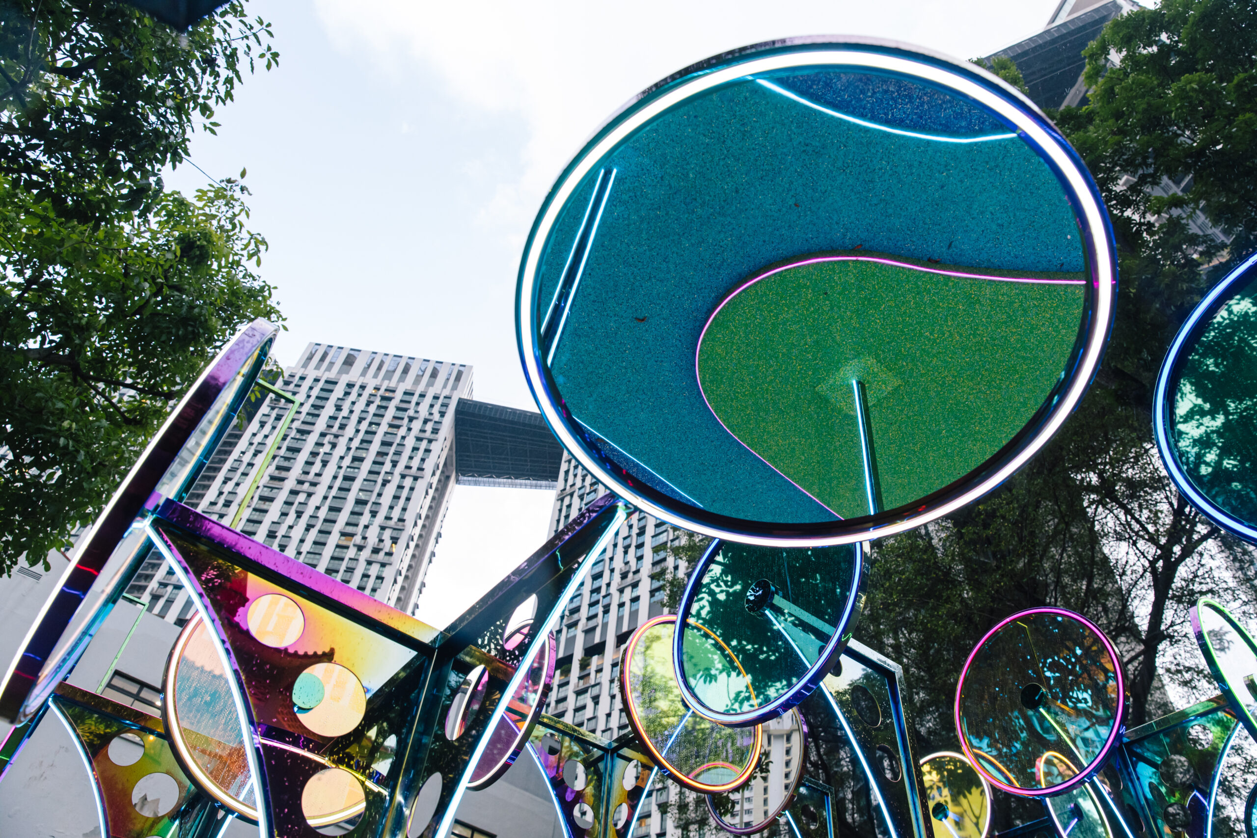 {still} life presents reflective surfaces of varying sizes, encouraging viewers to peer into them. Strategically positioned for the unexpected encounter, the viewer gazes downwards to see the sky, and looks up to see the ground. Certain mirrors function as picture frames highlighting and contrasting specific details in the environment—old vs new, natural vs manmade, public vs private. —drawing closer the lesser-noticed and bringing the past a little closer to the present. This jostling of views that {still} life brings forth epitomises Singapore’s urbanity: around something historic or conserved, there is, often, a very modernised step-in.
