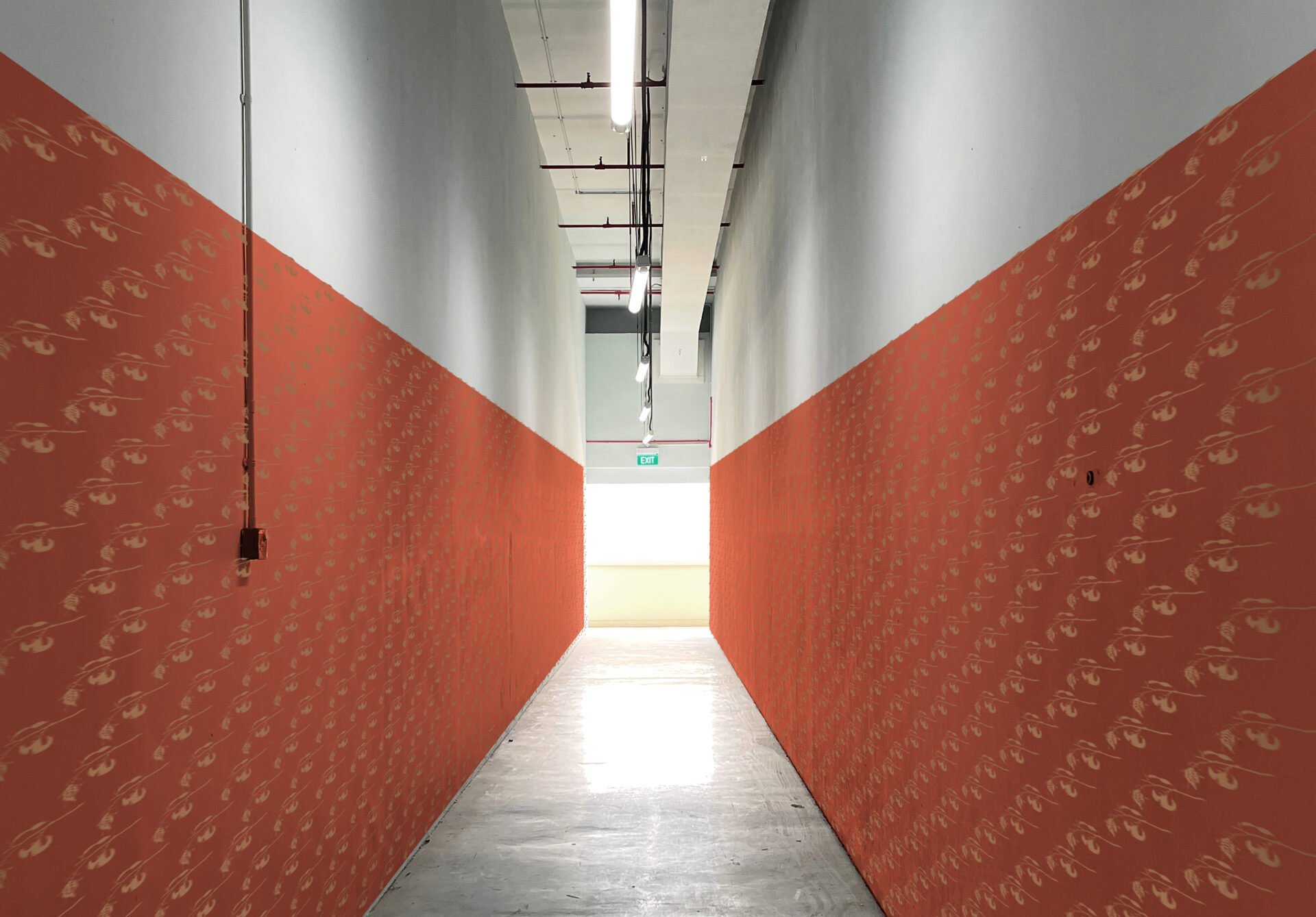 The gesture of overlaying the grimy surfaces of the building with a decorative stratum of nutmeg images subverts the identity of the place, while also creating new meaning. Applied deliberately in a repeated pattern, the surface embellishment is a human designed representation—an intervention to mark and colonise the space through the introduction of a foreign element. The nutmeg motifs in The fruit of deceit were taken from 19th century natural history illustrations that typically show a ripe nutmeg with the “red mace shining through the ruptured husk” and small inconspicuous lobed flowers. A plant that has both male and female reproductive organs but in separate individuals, the overabundance of female flowers functions as a trickery as only the lesser male flowers provide pollen. Nutmeg floral biology has no relation to its cultivation history in Singapore, but the concept of “pollination by deceit” uncannily parallels humanity’s precarious attraction to nature by terraforming the earth for the sake of “improvement.”