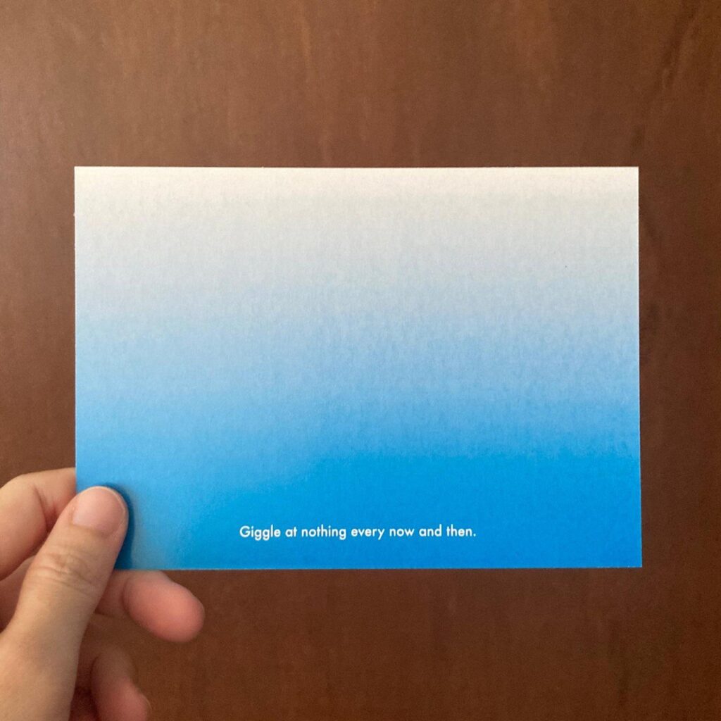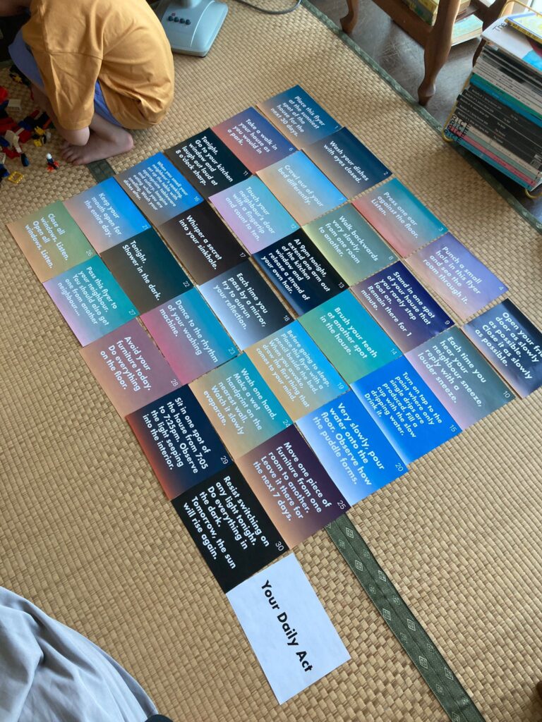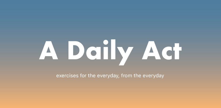 A Daily Act focuses on everyday, mundane life occurrences. Participants are encouraged to explore the emotional nuances of their daily routines, whether at home or on the streets. As they go about a regular day, some individuals may encounter instructions; they may walk past them on their way to the train station or pause to observe a postcard while enjoying their coffee. Over time, these prompts may lead their perceptions to shift, senses to sharpen and movements to become more deliberate.
